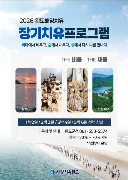 완도군이 4월부터 해양치유 활성화 및 효과 검증, 생활 인구를 확대하기 위해 '장기 체류형 해양치유 프로그램'을 운영합니다.