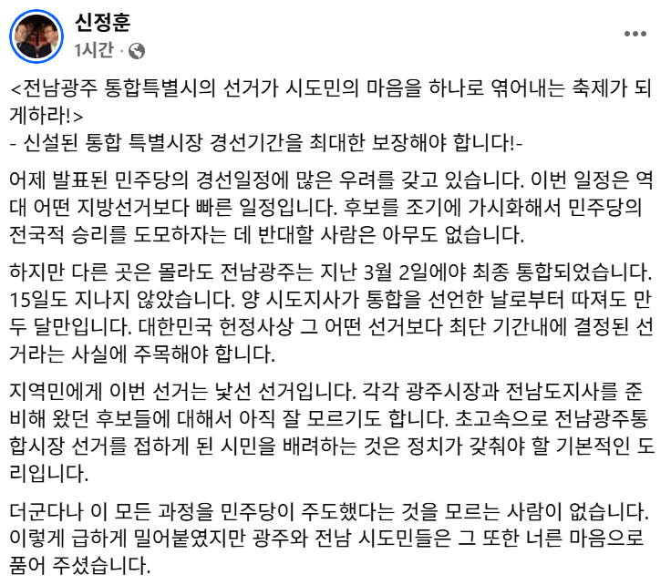 신 의원은 "어제 발표된 민주당의 경선일정에 많은 우려를 갖고 있다"며 "이번 일정은 역대 어떤 지방선거보다 빠른 일정이다. 다른 곳은 몰라도 전남·광주는 지난 3월 2일에야 최종 통합됐다"고 적었습니다.