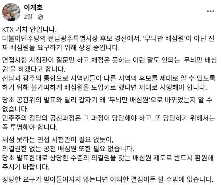 그럼에도 "당 지도부는 신설된 전남·광주에 대한 어떤 고려도 없이 타 시도 보다 가장 먼저 실시하겠다고 일정을 발표했다. 이건 유권자에 대한 무례이며 후보자에게는 한마디 상의도 없는 일방적인 결정"이라고도 했습니다.