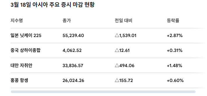 중국 상하이종합지수는 전날 대비 0.32% 오른 4,062.98를 기록했고, 대만 가권 지수 역시 TSMC의 급등에 힘입어 1.51% 상승하며 아시아 증시 전반의 온기를 이어갔습니다.