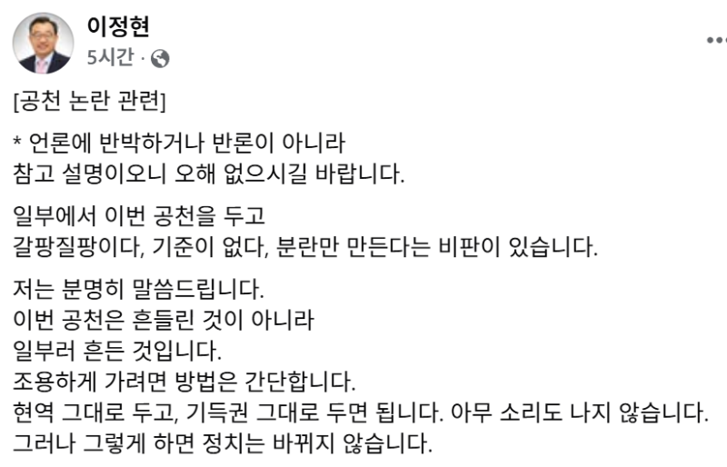 이 위원장은 이날 페이스북에 올린 글에서 "조용하게 가려면 방법은 간단하다. 현역 그대로 두고, 기득권 그대로 두면 된다"며 "그러나 그렇게 하면 정치는 바뀌지 않는다"고 말했습니다.