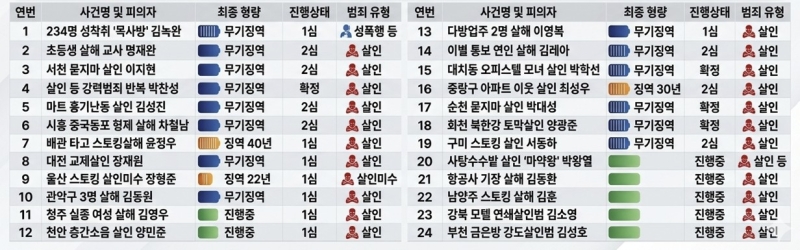 29일 연합뉴스에 따르면 2024년 1월 중대범죄신상공개법 시행 이후 공개된 24명을 분석한 결과 살인(미수 1건 포함) 범죄자가 23명(95%)으로 대부분을 차지했습니다.
