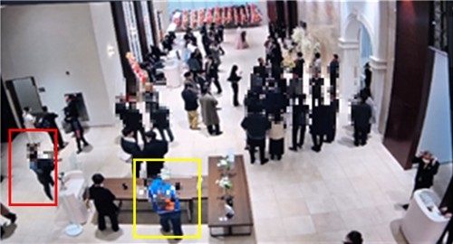 ▲예식장 하객을 상대로 상습 절도 행각을 벌인 60대 남성 A씨가 지난달 한 예식장에서 피해자를 지켜보는 장면. 빨간색 네모가 피의자, 노란색 네모가 피해자 [연합뉴스]