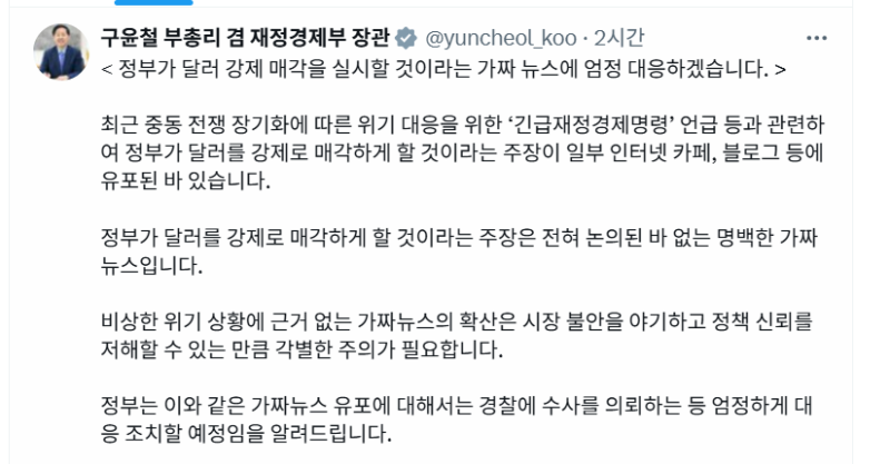 구 부총리는 이날 엑스(X·옛 트위터)에서 "중동 전쟁 장기화에 따른 위기 대응을 위한 '긴급재정경제명령' 언급 등과 관련해 정부가 달러를 강제로 매각하게 할 것이라는 주장이 일부 인터넷 카페나 블로그 등에 유포된 바 있다"며 이같이 지적했습니다.