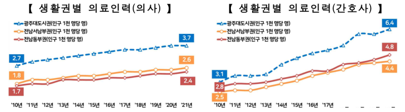 광주·전남지역 3대 생활권 중에서는 광주대도시권(광주, 나주, 담양, 화순, 함평, 영광, 장성)의 의료기관과 인력이 가장 많은 것으로 나타났습니다.