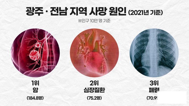 호남지방통계청의 사망원인별 사망률 조사에 따르면 광주ㆍ전남 지역에서는 암으로 인한 사망률이 인구 10만 명 기준 184.8명으로 가장 높았습니다.