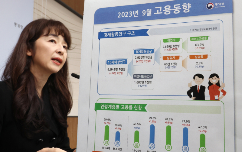 통계청이 13일 발표한 ‘2023년 9월 고용동향’에 따르면 2023년 9월 15세 이상 취업자는 2,869만 8천 명으로 전년동월대비 30만 9천 명(1.1%) 증가했고, 고용률은 63.2%로 전년동월대비 0.5%p 상승했습니다.
