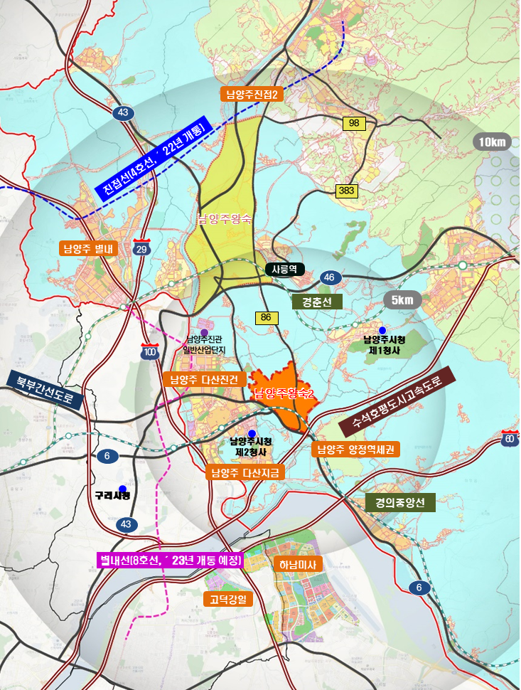 남양주 왕숙 신도시는 GTX-B와 지하철 9호선 등으로 서울 도심까지 30분대 출퇴근이 가능하며, 역세권 주변으로 주거와 일자리, 교육·의료·문화 등 도시 인프라를 융·복합하여 콤팩트하게 배치될 계획입니다.