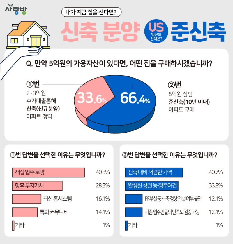 사랑방부동산이 지역민 610명을 대상으로 '5억 원이 있을 경우 신축 분양과 준신축 중 어느 쪽을 선택할지' 설문조사를 실시한 결과 66.4%가 금액에 맞는 10년 이내 준신축 아파트를 구매하겠다고 답한 것으로 조사됐습니다.
