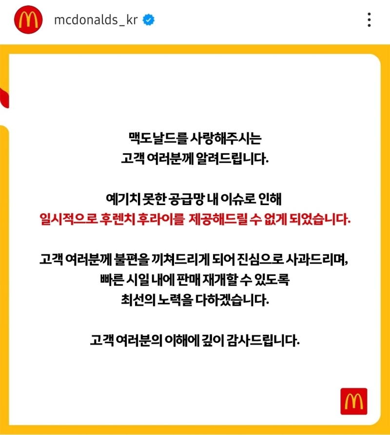 한국맥도날드는 20일 공식 SNS를 통해 "예기치 못한 공급망 내 이슈로 인해 일시적으로 후렌치 후라이를 제공해 드릴 수 없게 됐다"고 밝혔습니다.