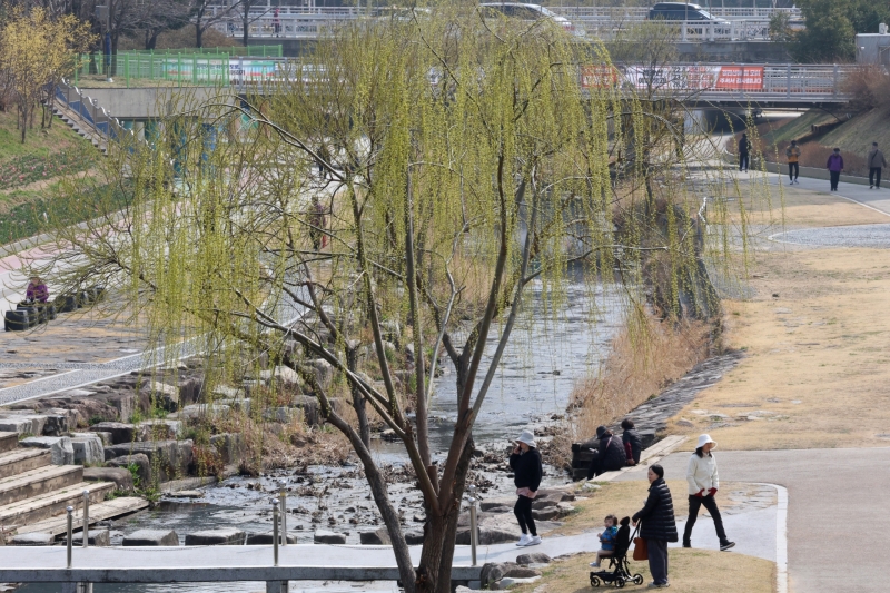 ▲천변에 수양버들 산책하는 시민들 [연합뉴스]
