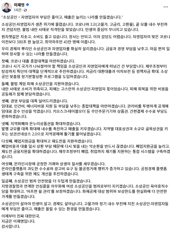 이 후보는 4일 자신의 SNS에 "내란 사태로 소비가 위축되면서 피해가 고스란히 소상공인과 자영업자에게 돌아갔다"며 "공동체가 피해 회복 비용을 함께 분담해야 한다"고 말했습니다.