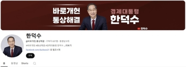 유튜브와 페이스북 채널에는 '바로개헌, 통상해결, 경제대통령 한덕수'라는 표어가 걸렸습니다.