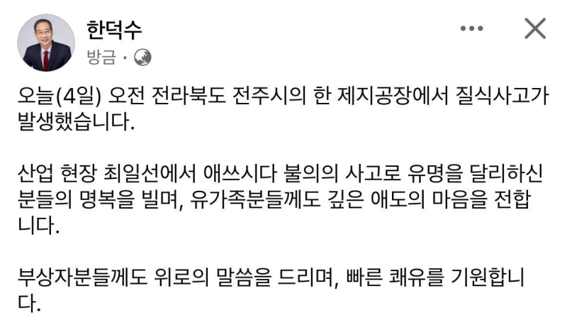 무소속 대선 예비후보 한덕수 전 국무총리가 4일 전북 전주시에서 발생한 제지공장 질식 사고에 대해 희생자와 유가족에게 깊은 애도를 표했습니다.