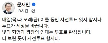 앞서 문 전 대통령은 전날에도 사회관계망서비스(SNS)에 "사전 투표 잊지 맙시다. 투표가 세상을 바꿉니다. 빛의 혁명과 광장의 연대는 투표로 완성됩니다. 더 보란 듯이 사전 투표합시다"라는 글을 게시하기도 했습니다.