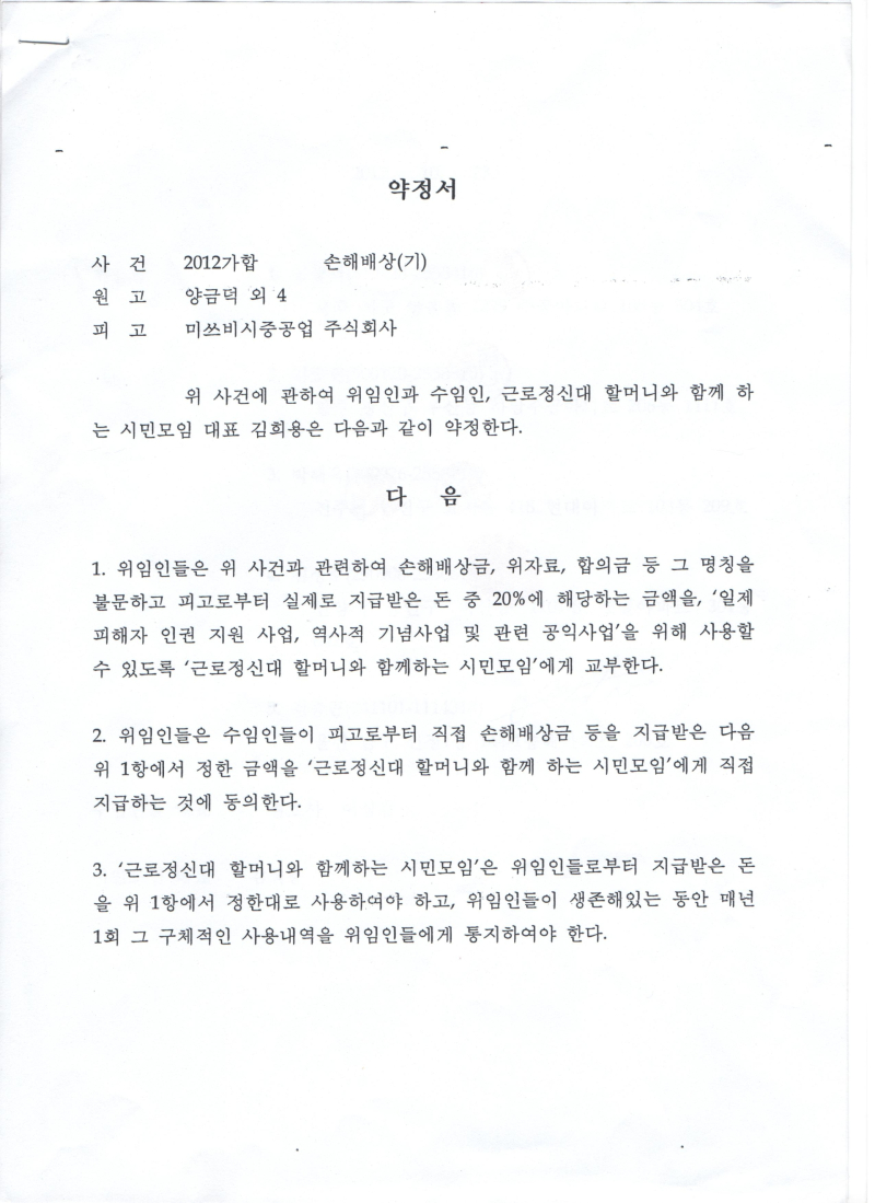 약정서에는 "피고로부터 실제로 지급받은 돈 중 20%에 해당하는 금액을, '일제 피해자 인권 지원 사업, 역사적 기념사업 및 관련 공익사업'을 위해 사용할 수 있도록 '근로정신대 할머니와 함께하는 시민모임'에게 교부한다"고 적혀 있습니다.