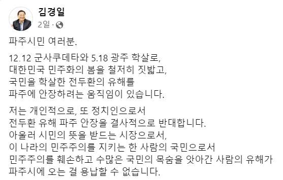 김경일 파주 시장은 지난 1일 자신의 SNS에 "12·12 군사쿠데타와 5·18 광주 학살로, 대한민국 민주화의 봄을 철저히 짓밟고 국민을 학살한 전두환의 유해를 파주에 안장하려는 움직임이 있다"며 "개인적으로, 또 정치인으로서 전두환 유해 파주 안장을 결사적으로 반대한다"고 적었습니다.