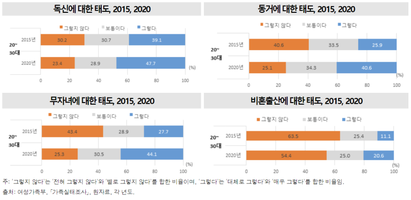 독신에 대한 긍정적 인식은 2015년 39.1%에서 2020년 47.7%로 증가했습니다.