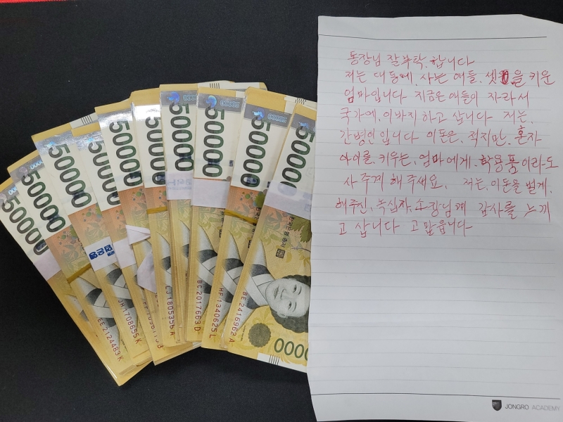 익명의 기부자가 학생들을 위해 써 달라며 현금 1천만 원을 행정복지센터에 맡긴 뒤 사라졌습니다.
