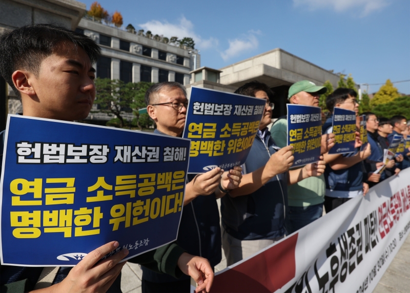 헌법소원 법률대리를 맡은 민주노총 법률원 소속 김주연 변호사는 "연금 재정 운용에 실패해 돈이 없는 것은 정부인데 허리띠를 졸라매야 하는 것은 노동자"라며 "퇴직 시기가 연금지급 개시 시기와 일치하지 않도록 한 부칙은 공무원들의 재산권·평등권·인간다운 생활을 할 권리를 침해하는 위헌 조항"이라고 주장했습니다.