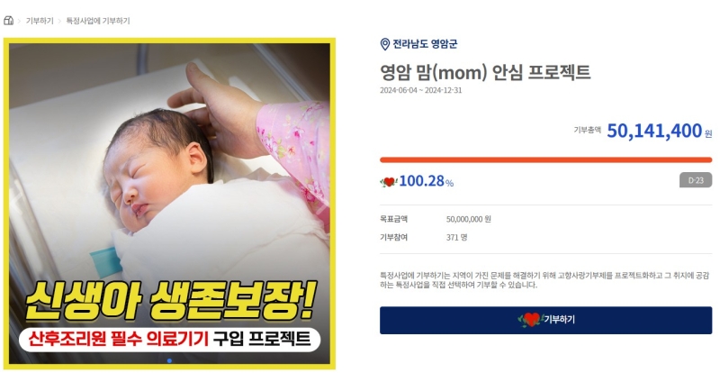 영암 맘 안심프로젝트는, 2027년 개원할 영암군 공공산후조리원의 의료기기 구입비를 마련하기 위한 기부로.지난해 2억 2,000만 원을 목표로 진행됐습니다.