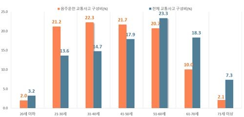 연령대별로 보면 전체 교통사고는 50대(51∼60살) 운전자 구성비가 높았으나, 음주운전 사고는 30대(31∼40살) 운전자가 22.3%로 가장 높게 나타났습니다.