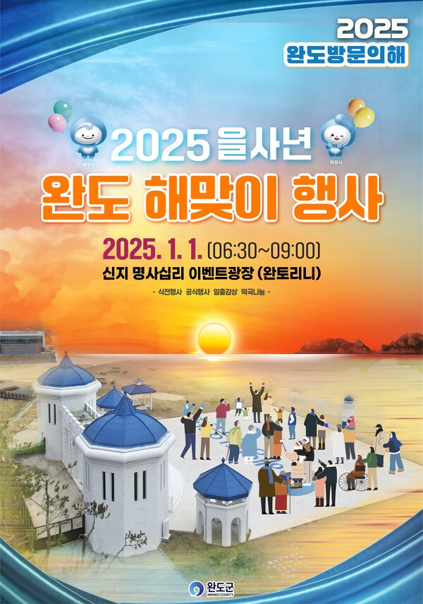 완도해양치유센터가 특별 개관하는 2025년 1월 1일 신지 명사십리 이벤트 광장 '완토리니'(명사십리길 85-207)에서 '을사년 해맞이 행사'가 열립니다.