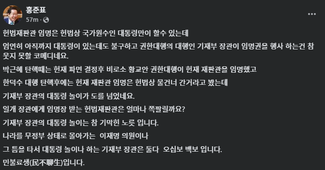 홍 시장은 2일 자신의 SNS에 "엄연히 아직 대통령이 있는데도 권한대행의 대행인 기재부 장관이 임명권을 행사하는 건 웃지 못할 코미디"라면서 "헌법재판관 임명은 헌법상 국가원수인 대통령만이 할 수 있다"라고 주장했습니다.
