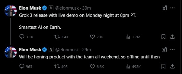 일론 머스크 테슬라 최고경영자(CEO)가 자신의 인공지능(AI) 기업인 xAI의 AI 챗봇 최신 모델 '그록(Grok)3'을 오는 17일, 미국 서부 시간 밤 8시에 공개한다고 밝혔습니다.