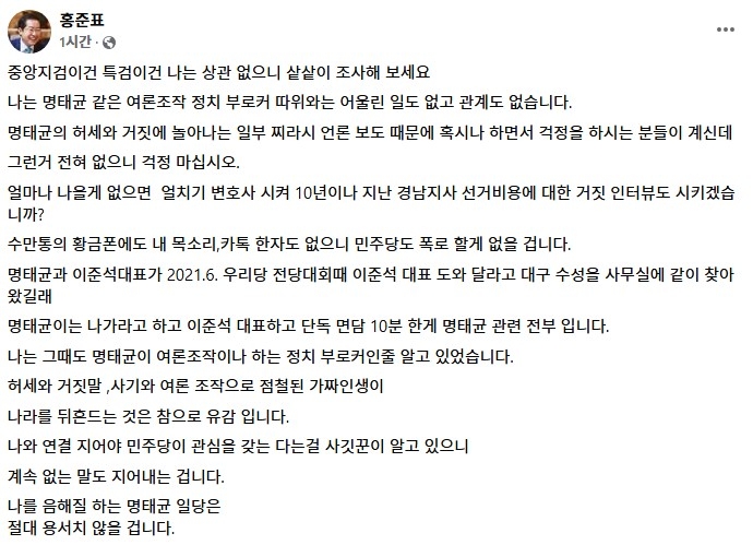홍 시장은 또 "중앙지검이건 특검이건 나는 상관없으니 샅샅이 조사해 보라"고도 했습니다.