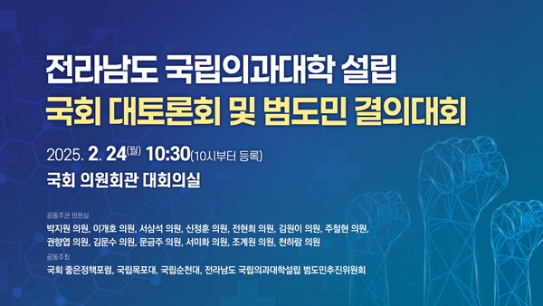 전라남도 의과대학 신설 국회대토론회 및 범도민결의대회가 24일 오전 10시 30분 국회의원회관 대회의실에서 열립니다.