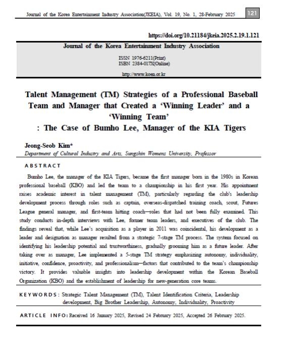 12일 한국엔터테인먼트산업학회 논문지 최신 호에 따르면 최근 성신여대 문화산업예술대학원 김정섭 교수는 '우승 지도자와 우승 팀을 만든 프로야구단과 감독의 탤런트 매니지먼트 전략 : 이범호 KIA 타이거즈 감독의 사례'라는 제목의 논문을 통해 관련 내용을 소개했습니다.