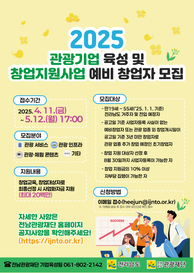 전라남도와 전남 관광재단이 '2025 관광기업 육성 및 창업지원사업' 참가자를 5월 12일까지 모집합니다.