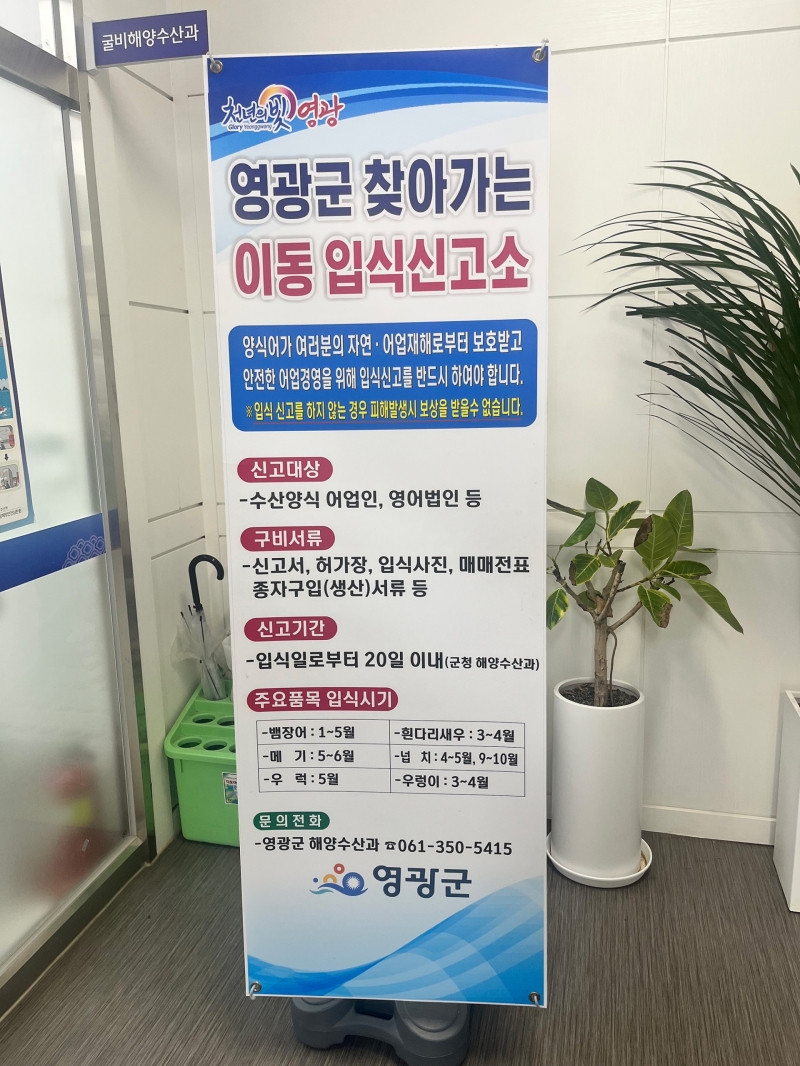▲ 전라남도가 양식장 6,518개소를 대상으로 '찾아가는 이동 입식신고소'를 운영한다. 사진은 영광군에 설치된 이동 입식신고소 배너의 모습 [전라남도]