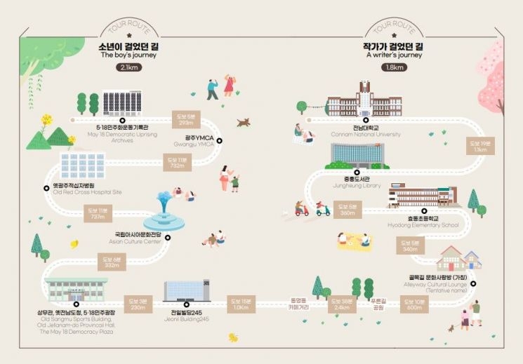 '소년의 길'은 '소년이 온다' 속 실제 장소와 5·18 민주화운동의 실제 현장, 관련 문화시설과 함께 한강 작가가 유년시절을 보냈던 북구 중흥동 일대와 그의 모교 등으로 구성됐습니다.