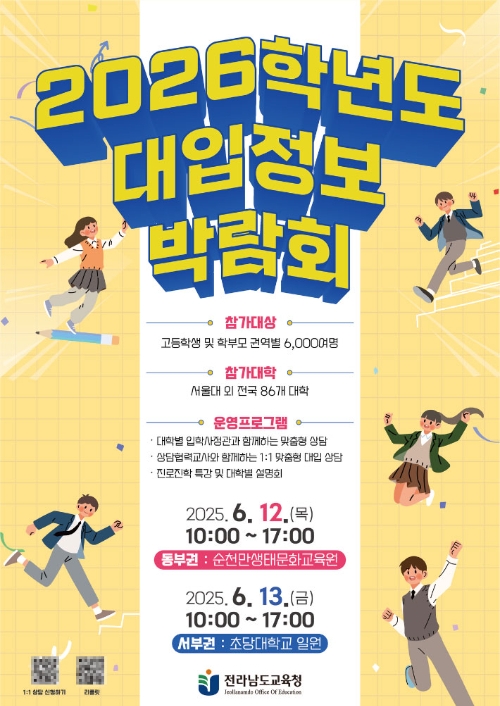 전남교육청이 다음 달 12일 순천만생태문화교육원, 13일 초당대학교에서 '2026학년도 대입정보 박람회'를 개최합니다.