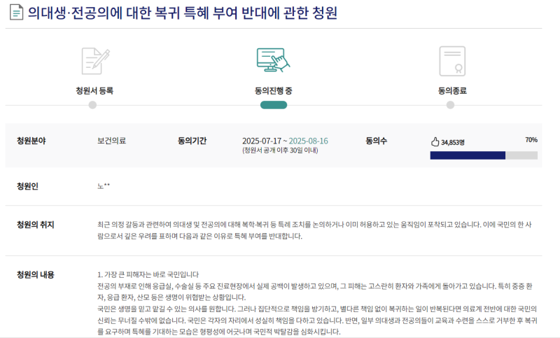 의대 정원 증원에 반발해 학교와 수련병원을 이탈한 의대생과 전공의들이 최근 복귀 움직임을 보이자, 정부의 특혜 부여를 반대한다는 국민청원에 3만 명이 넘는 사람이 동의했습니다.