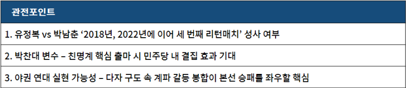 다만, 계파 갈등과 후보 단일화 여부가 본선 경쟁력에 직접적인 영향을 미칠 전망입니다.