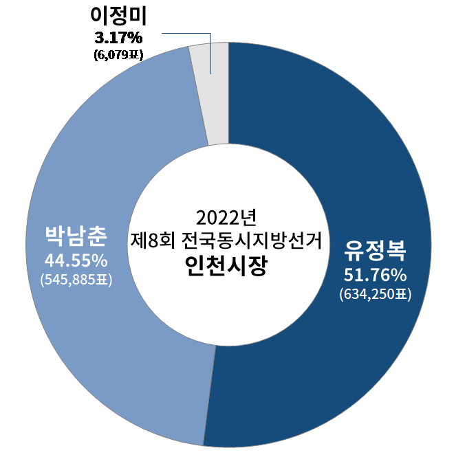 2022년 제8회 전국동시지방선거 인천광역시장 선거에서 국민의힘 유정복 후보가 63만 4,250표(득표율 51.76%)를 얻어 당선됐습니다.