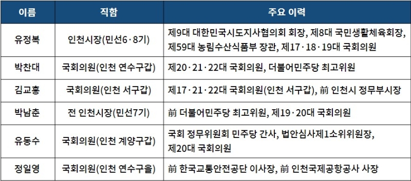 경인일보, 중부일보 등 여러 언론에 따르면 ▲유정복 현 인천시장 ▲박찬대 국회의원 ▲김교흥 국회의원 ▲박남춘 전 인천시장 ▲유동수 국회의원 ▲정일영 국회의원 등이 출마 예정자로 거론되고 있습니다.