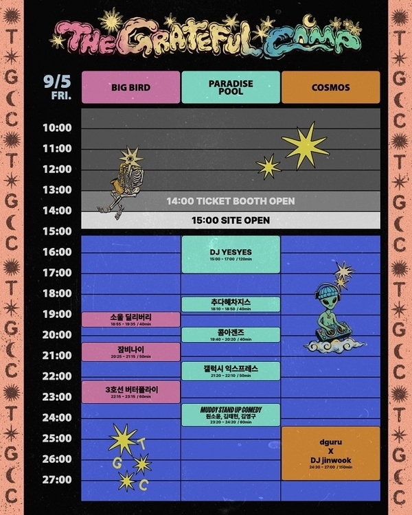 한국 인디록의 전설 3호선 버터플라이, 일본의 시네마틱 사운드 아티스트 VIDEOTAPEMUSIC, 폭발적인 라이브의 이디오테잎, 실험적 색소폰 연주의 김오키 럽럽, 강렬한 퍼포먼스의 갤럭시 익스프레스, 몽환적 프로듀서 키라라, 그리고 TGC의 호스트 CHS가 함께 무대를 채웁니다.