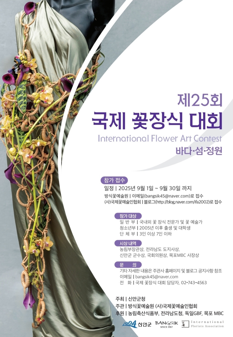 참가 접수는 30일까지 진행되며, 대회를 주관하는 방식꽃예술원 이메일 또는 (사)국제꽃예술인협회 블로그를 통해 신청할 수 있습니다.