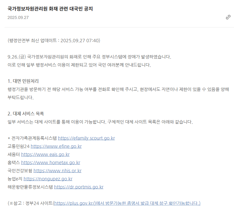 국가정보자원관리원(국정자원) 화재로 국가 전산망 기능이 사실상 마비되면서 정부가 민간 플랫폼인 네이버와 다음을 대국민 공지 대안 창구로 활용하고 있습니다.