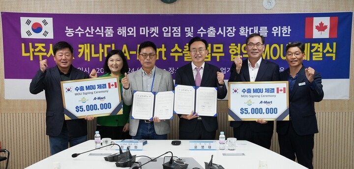 나주시는 24일 전라남도 농업기술원에서 캐나다 A-Mart와 500만 달러 규모의 농수산식품 수출 업무협약을 체결했다고 밝혔습니다.
