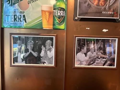 매장 안에는 황 CEO와 이 회장, 정 회장이 앉았던 테이블 주변으로 이들이 함께 '치맥'(치킨과 맥주)을 즐기는 사진이 붙어있었습니다.