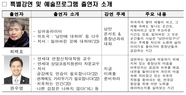 이번 개소식에서는 사전에 신청한 중장년 100여 명이 참석한 가운데 연세대 연합신학대학원 권수영 교수의 특별강연 ‘지금 미래를 준비하라’와 가수 최백호의 ‘낭만콘서트와 중장년과의 대화’ 프로그램을 진행합니다.