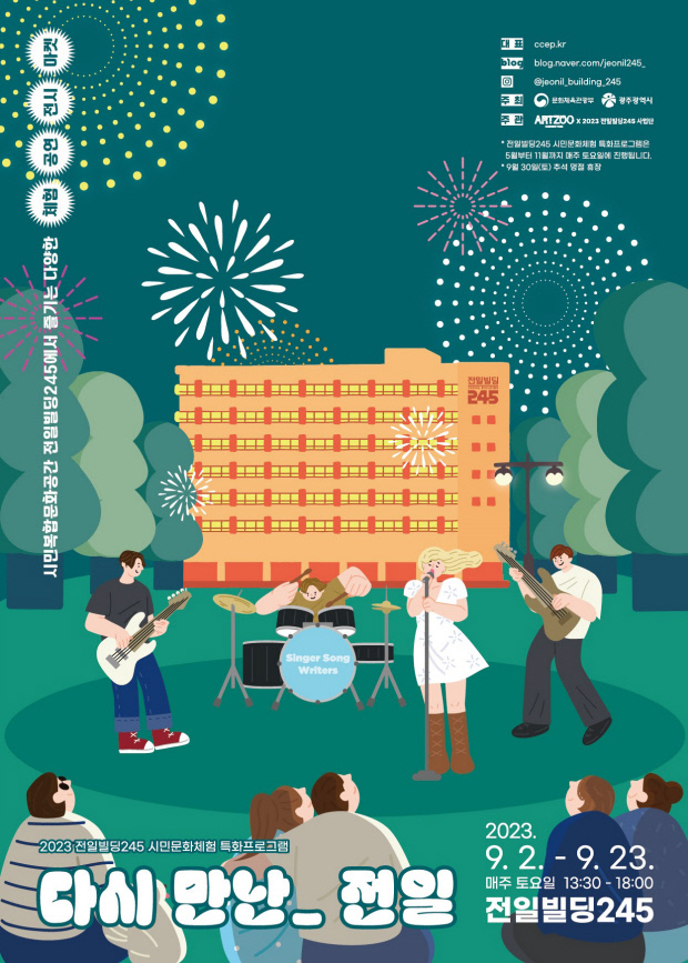 전일빌딩245에서는 16일 토요일에도 명랑가족아트놀이터 '하하호호'와 '버스킹 오아시스', 미디어의밤' 등이 열리는 등 매주 토요일 다양한 무료 문화행사가 펼쳐집니다.