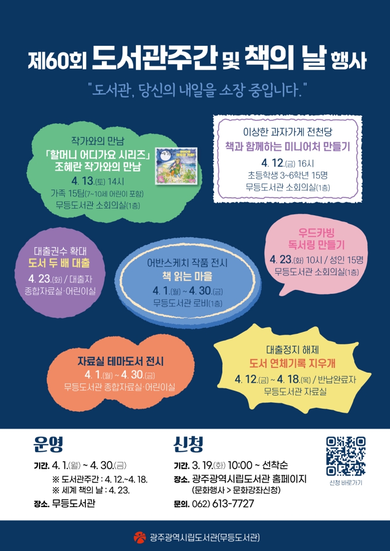 제60회 도서관주간(4월 12~18일)과 책의 날(4월 23일)을 맞아 진행되는 이번 행사는 시민들이 책과 더 친해질 수 있도록 다양한 프로그램이 마련됐습니다.