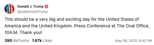 트럼프 대통령은 8일(현지시간) 자신이 설립한 소셜미디어 트루스소셜에서 미국 동부시각으로 이날 오전 10시 백악관 집무실에서 기자회견이 열린다고 공지하며 "미국과 영국에 매우 중요하고 흥미진진한 날이 될 것"이라고 밝혔습니다.