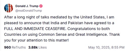 도널드 트럼프 미국 대통령은 10일(현지시각) 자신의 SNS에 글을 올려 인도와 파키스탄의 휴전 소식을 알렸습니다.